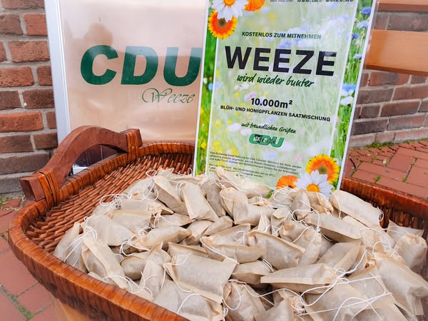 Um Zusendung von Fotos von blühenden Blumen, die aus der Saatmischung entstanden sind, an gemeindeverband@cdu-weeze.de oder Abgabe im CDU-Büro, Wasserstrasse 4 wird gebeten. Als Belohnung werden im Rahmen einer Verlosung Überraschungsgeschenke vergeben.