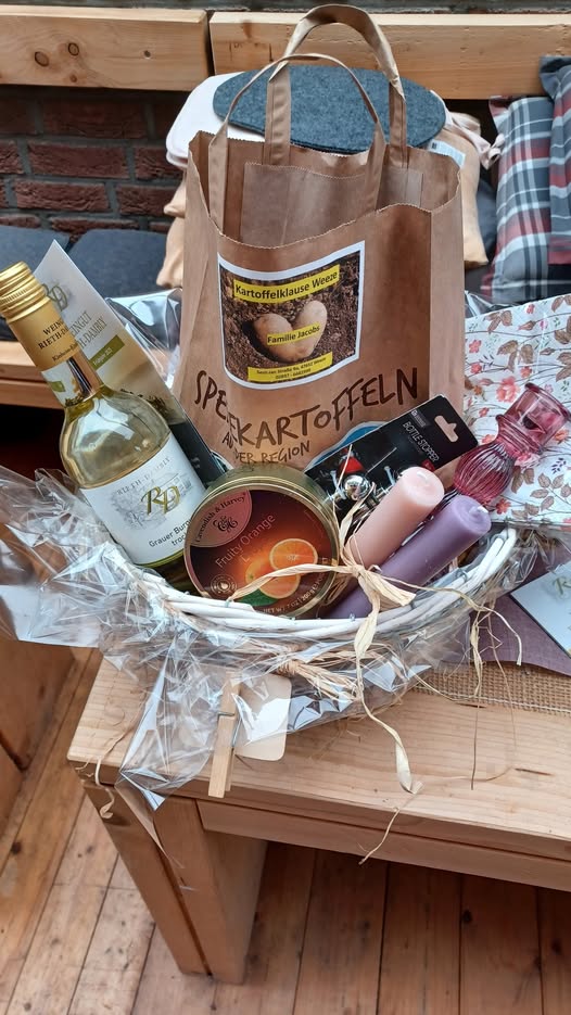 Ein Geschenkkorb mit leckeren Kartoffeln, eine Flasche Wein von unserem Winzer und noch ein paar nette Kleinigkeiten.