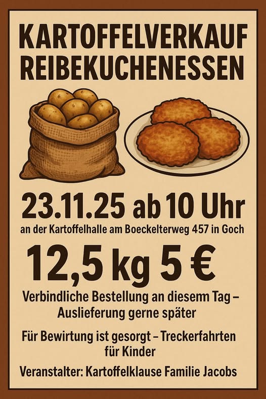 Schaut gerne bei uns rein. Es gibt leckere Reibekuchen, Getränke warm und kalt.